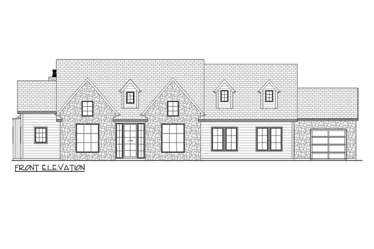 The home footprint measures approximately 88′ wide × 67′ 6″ deep, giving it a generous, grounded presence on the lot. 0 The roof design is rustic and steep — with a primary pitch of 14:12 and a secondary at 7:12 — creating a dramatic mountain-house silhouette. 1 The 3-car garage, with both front and side entry, blends seamlessly into the design, offering practical storage and parking while preserving the inviting front façade. 2
