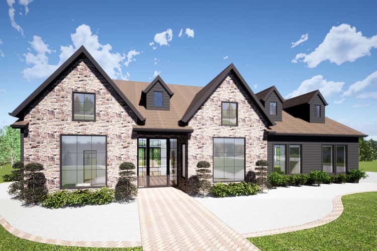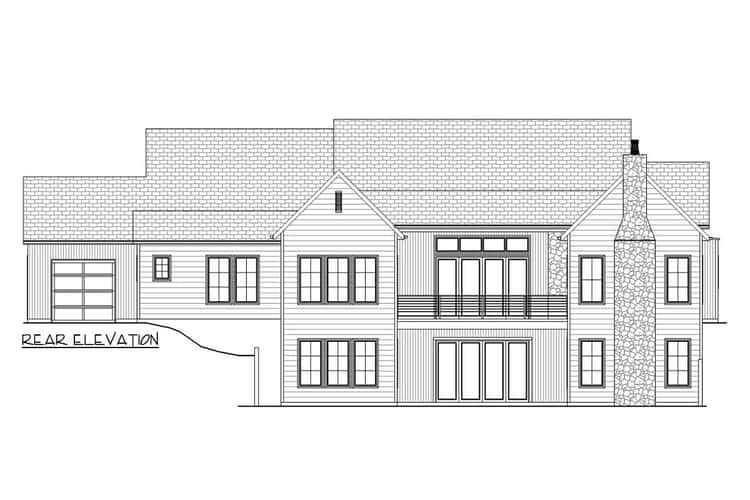 The home footprint measures approximately 88′ wide × 67′ 6″ deep, giving it a generous, grounded presence on the lot. 0 The roof design is rustic and steep — with a primary pitch of 14:12 and a secondary at 7:12 — creating a dramatic mountain-house silhouette. 1 The 3-car garage, with both front and side entry, blends seamlessly into the design, offering practical storage and parking while preserving the inviting front façade. 2