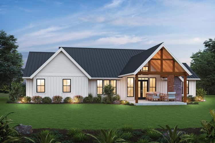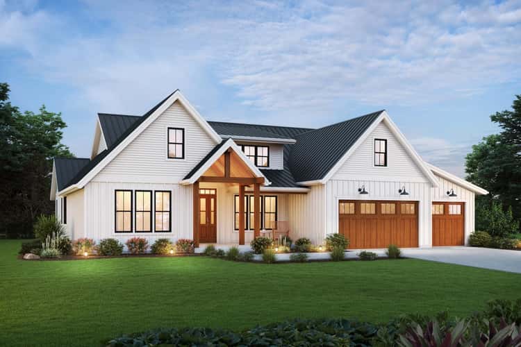 Architectural themes run from modern farmhouse and Craftsman to New American and refined French Country. Signature exterior touches include tapered or squared porch columns, mixed cladding (board-and-batten, clapboard, stone or brick accents), and gabled rooflines. Many plans emphasize a welcoming covered front porch or an expansive rear porch that functions as an outdoor room—sometimes with room for an outdoor kitchen or fireplace.