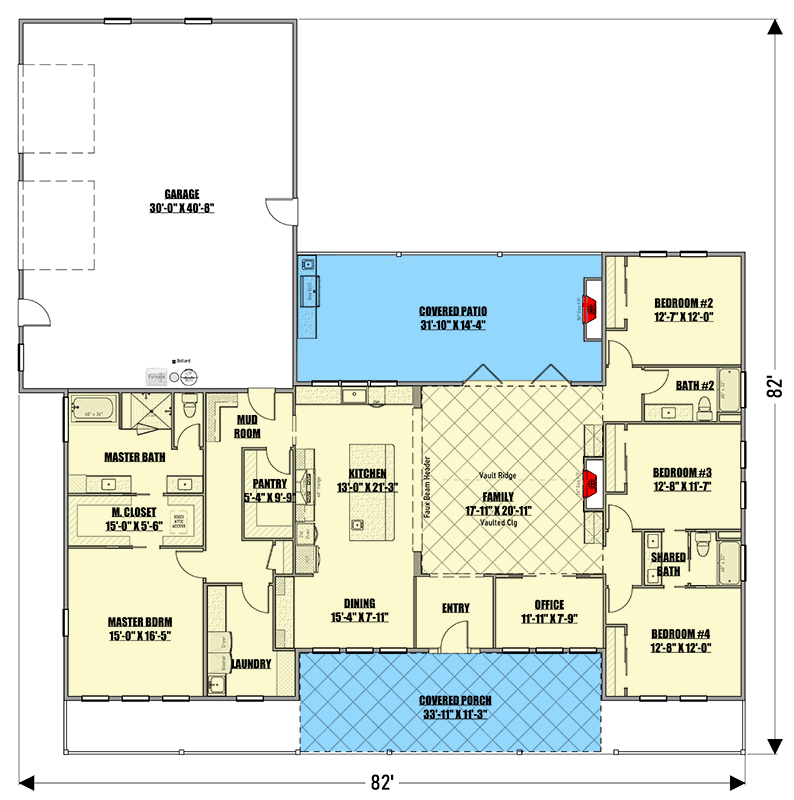 The plan uses a “split-bedroom” layout. The master suite is positioned on one side of the house for privacy, while the three other bedrooms sit on the opposite wing — giving separation between adult and children/guest spaces. 8