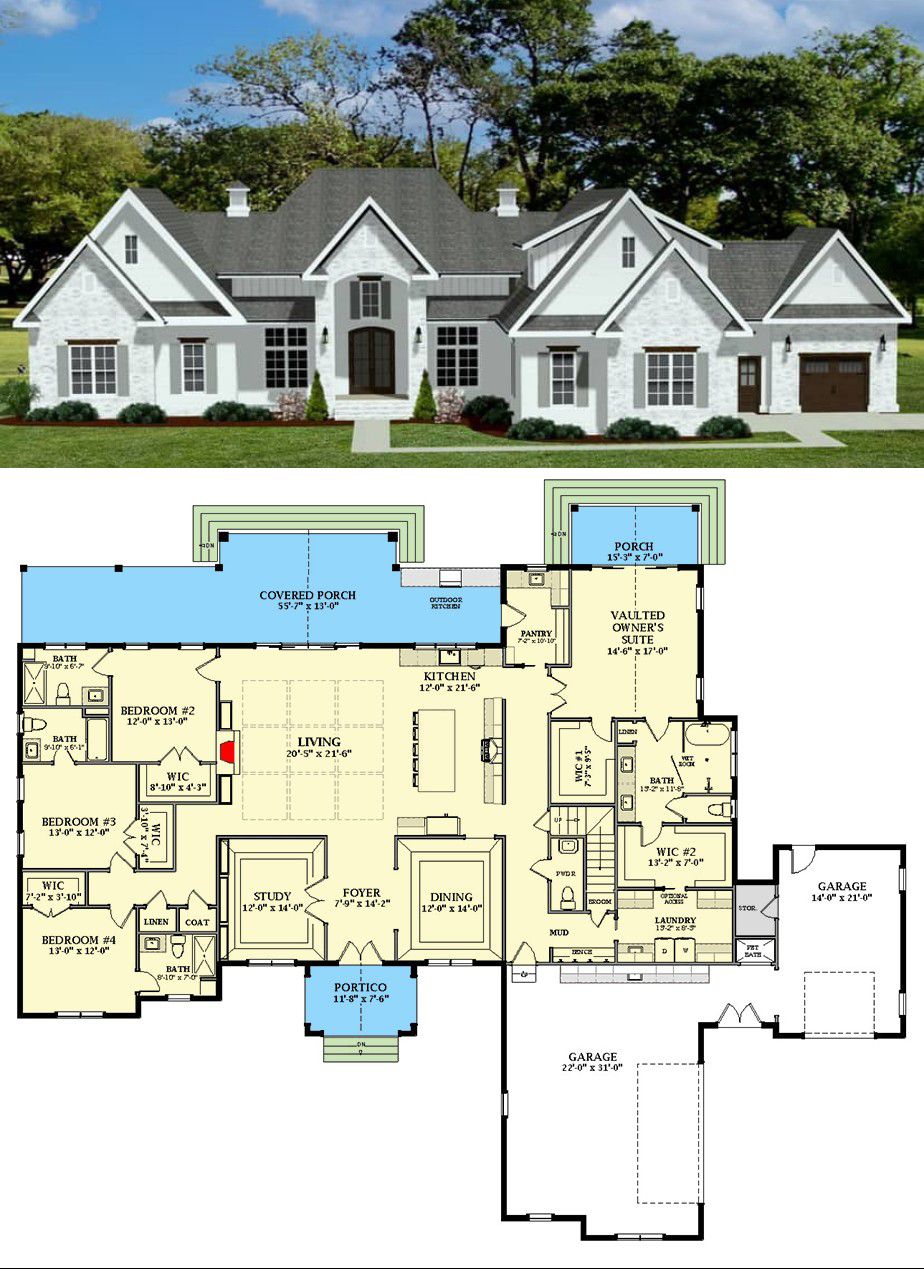 The home spans roughly 102′ wide × 84′ deep, with a maximum ridge height around 30′. 1 The exterior styling leans on a Southern / French-Country / New-American aesthetic, with clean rooflines, a mix of traditional and transitional details, and a welcoming front façade. The 3-car attached garage (side and front entry) provides plenty of parking and storage while keeping the front exterior balanced and functional. 2