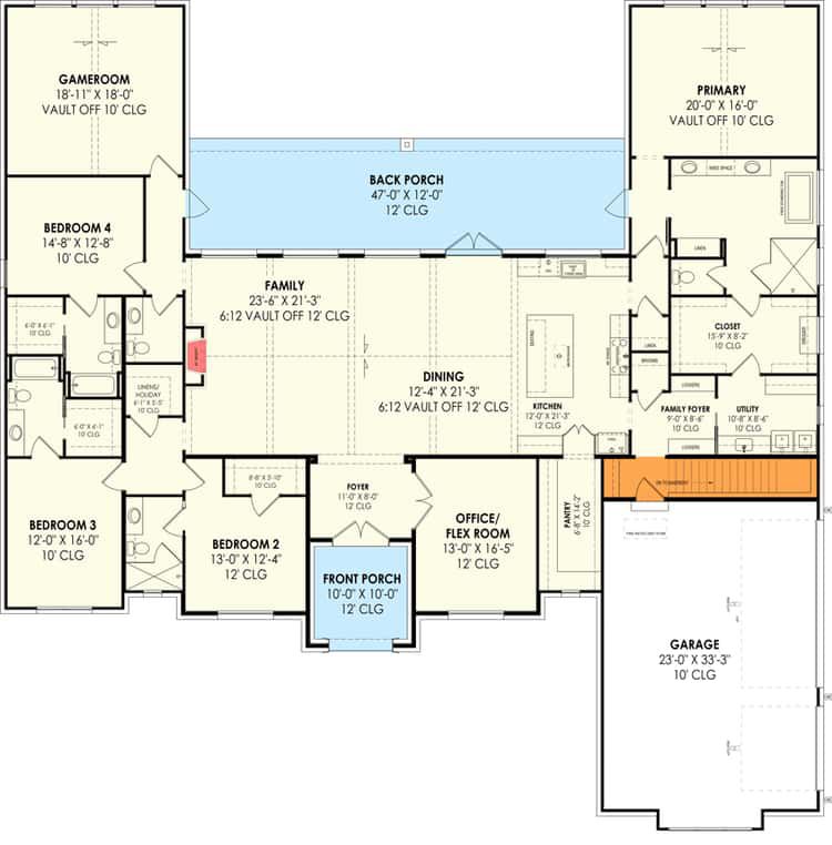 This 4-bed transitional home plan stands out because it balances flexibility, space, and practicality. With generous common spaces, private suites, versatile rooms for work or play, plenty of storage, and single-level convenience, it suits families, multigenerational households, or those planning for the long haul. It offers a strong combination of comfort, function, and style — a home built for real living, not just for show.