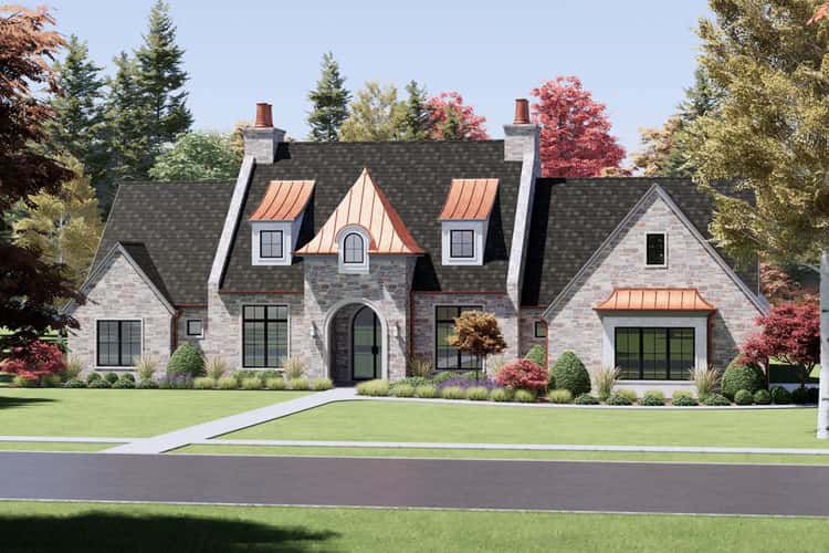The exterior features a stone façade with two dormers flanking an arched, covered front entry — giving the home classic character and welcoming symmetry. 0 Large windows on either side of the entry flood the interior with natural light while offering balanced curb appeal. 1 The footprint measures about 88′ 10″ wide × 85′ 1″ deep, with a maximum ridge height of roughly 33′ 9″ — a substantial but well-proportioned size for a large family or multigenerational household. 2