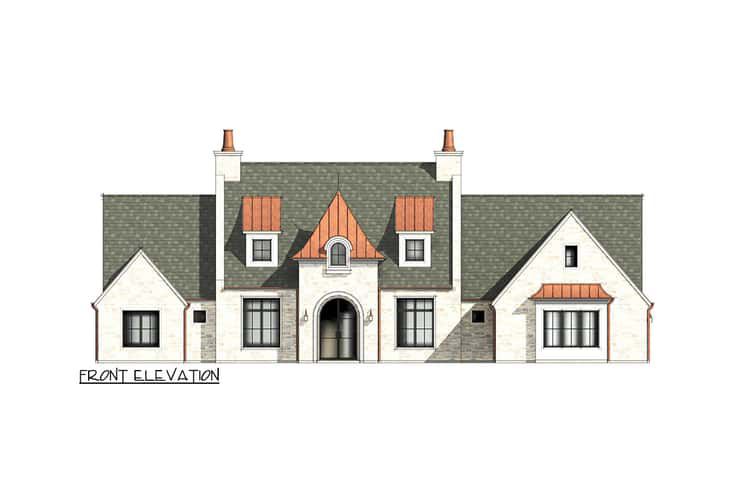 The exterior features a stone façade with two dormers flanking an arched, covered front entry — giving the home classic character and welcoming symmetry. 0 Large windows on either side of the entry flood the interior with natural light while offering balanced curb appeal. 1 The footprint measures about 88′ 10″ wide × 85′ 1″ deep, with a maximum ridge height of roughly 33′ 9″ — a substantial but well-proportioned size for a large family or multigenerational household. 2
