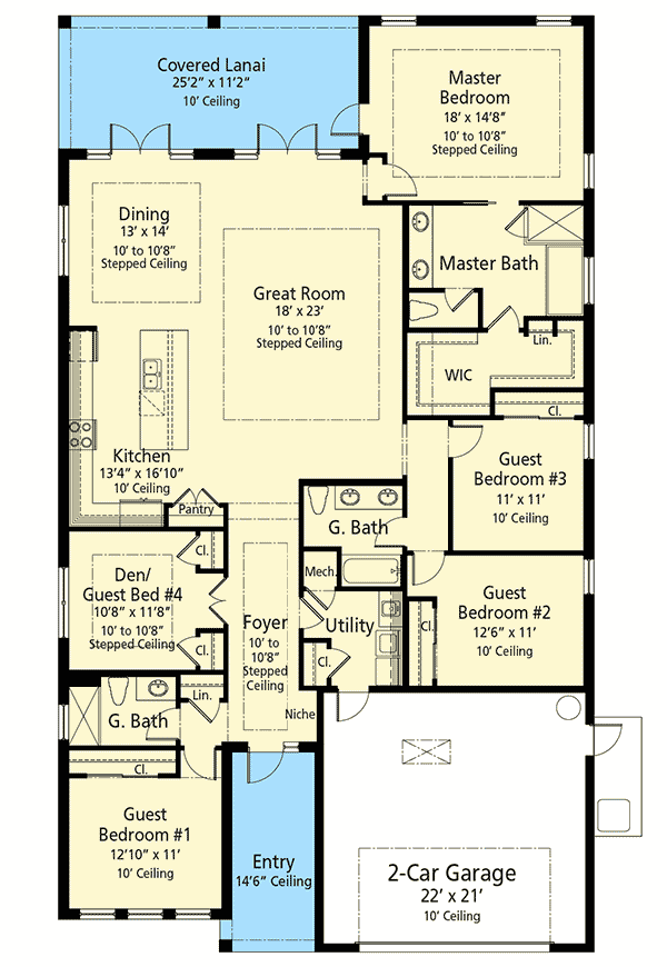 At the core is an open great room that flows seamlessly into the dining area and kitchen — encouraging connection, flexibility, and a sense of spaciousness. 6 French doors from the great room lead to a covered back lanai, extending your living space outdoors for relaxation or entertaining. 7