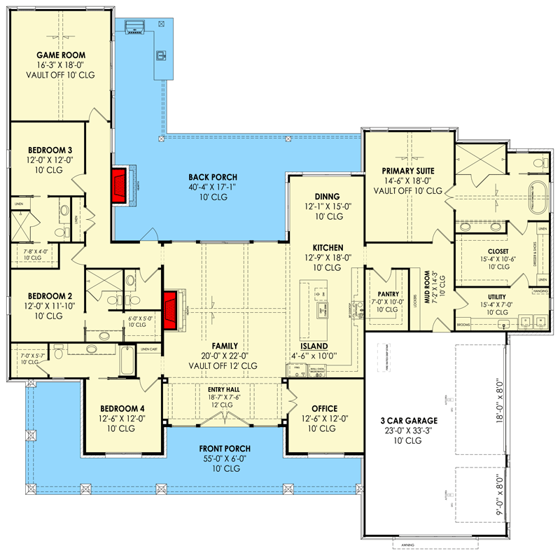 - Three additional bedrooms, each with access to full baths, lie along the left side of the home, creating an efficient and balanced arrangement for family or guests. 8