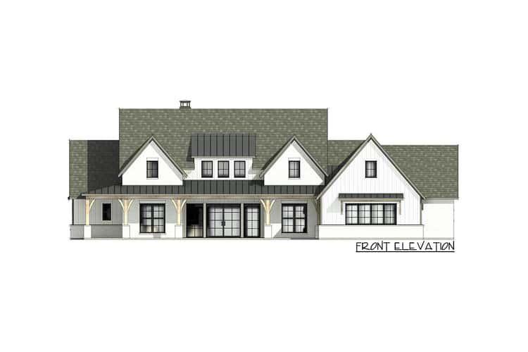 The footprint spans about 89′ 10″ wide by 87′ 8″ deep. 1 A bold, shed-dormer feature with three windows sits above the welcoming six-foot deep front porch, flanked by twin gables—this gives the home a strong modern farmhouse street presence. 2