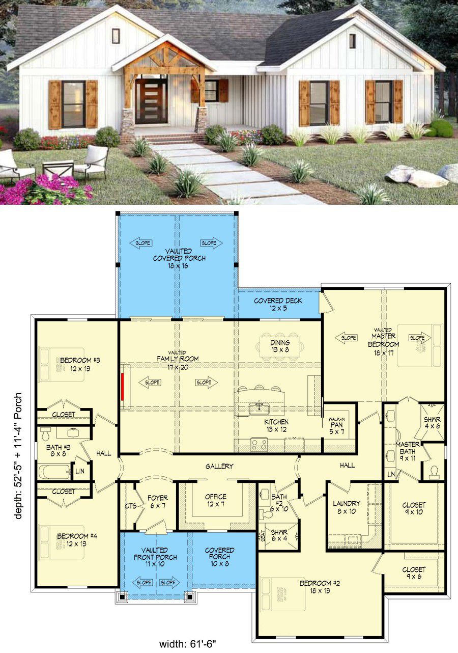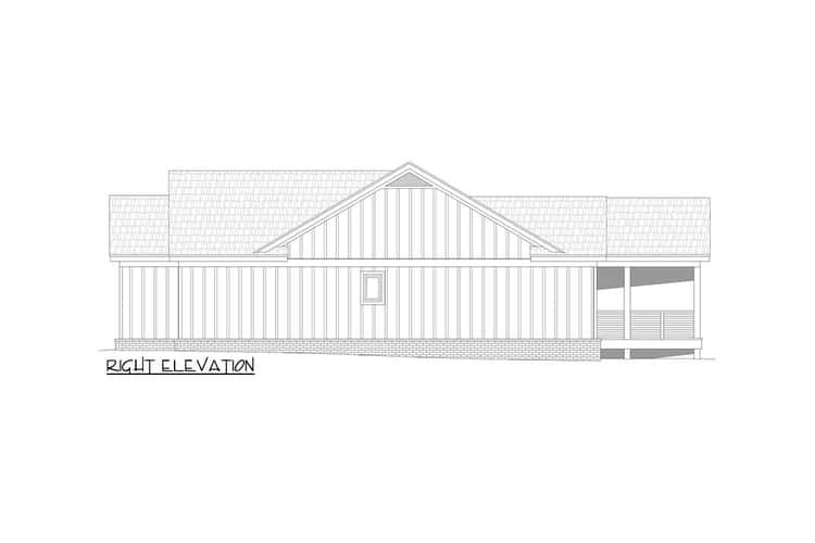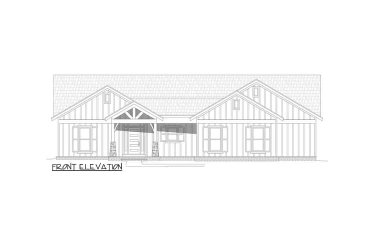 The plan features a rustic country aesthetic with a timbered vaulted entry porch, which sets a warm, welcoming tone. 1 The façade width is 64′ 6″ and the depth is 63′ 9″. 2 The roof has a primary pitch of 7 on 12, with a secondary slope of 3 on 12. 3 A ridge height of 19′ 1″ gives modest vertical scale (appropriate for one-level construction). 4