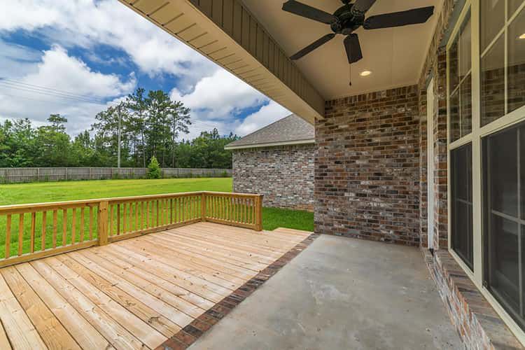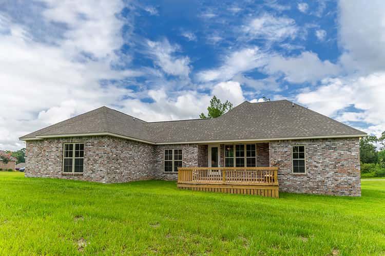 The front façade features a brick exterior with timber accent details, giving a blend of rustic warmth and sturdy construction feel.