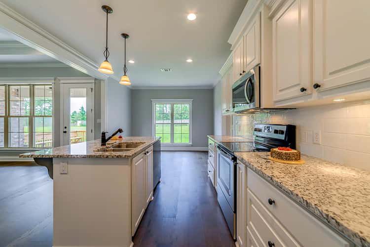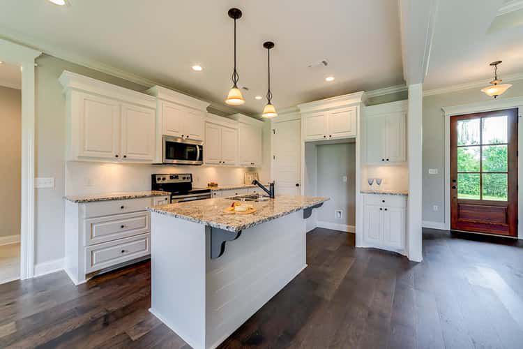 The kitchen includes a large island with an eating bar, and is open to the dining room and great room—this allows interaction while cooking and enhances the sense of connectedness.