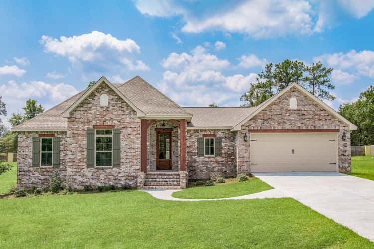 The front façade features a brick exterior with timber accent details, giving a blend of rustic warmth and sturdy construction feel.