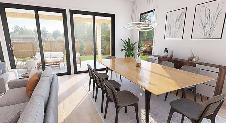 From the plan you can also note the open-concept space flows without many partitions, which fosters social interaction and flexible usage of the living/dining/kitchen zone. The generous sliding doors and the covered porch extend that space outdoors.