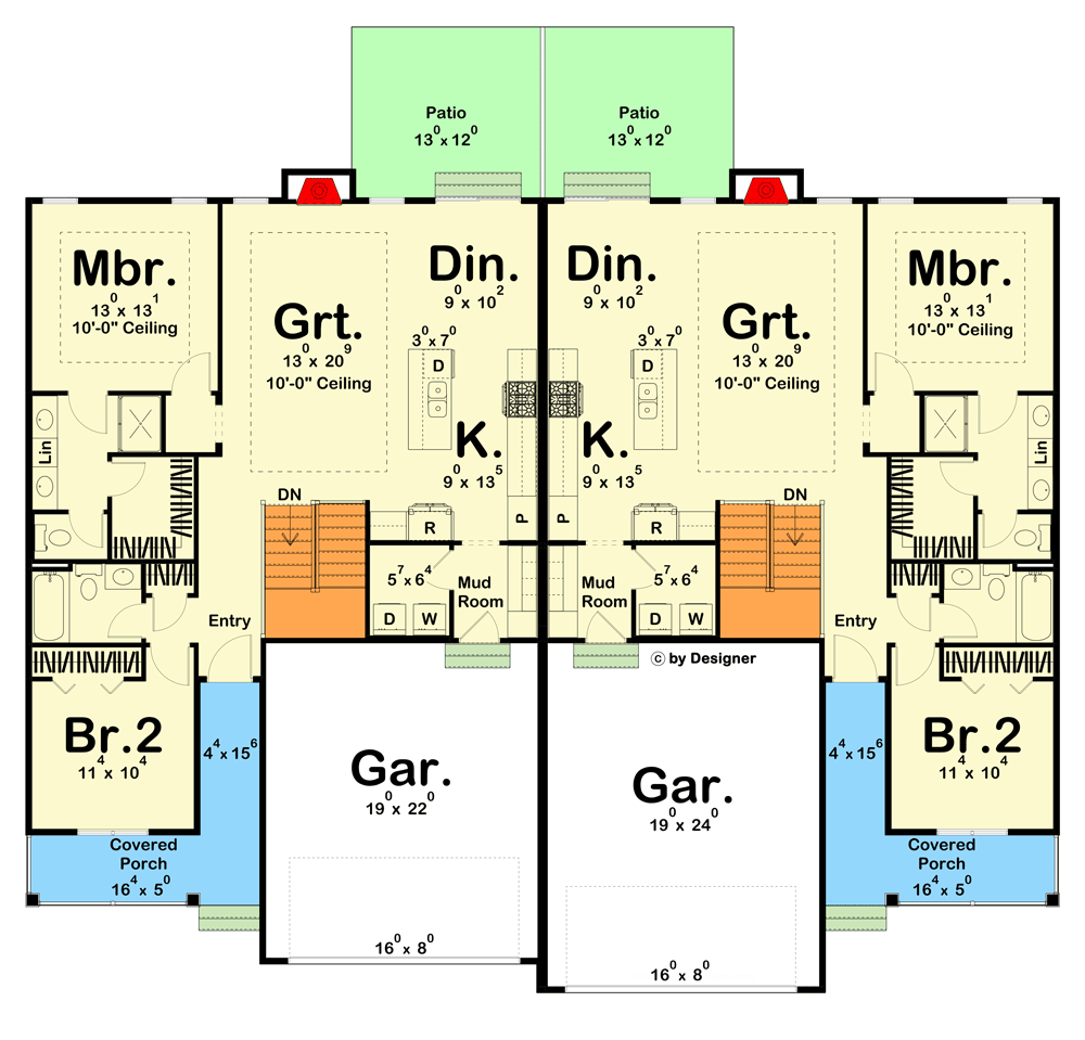 An interesting exterior layout detail: the garages for the two units are “staggered” so each unit has its own two-car garage but positioned slightly differently to give visual separation and allow each front porch to feel individual.