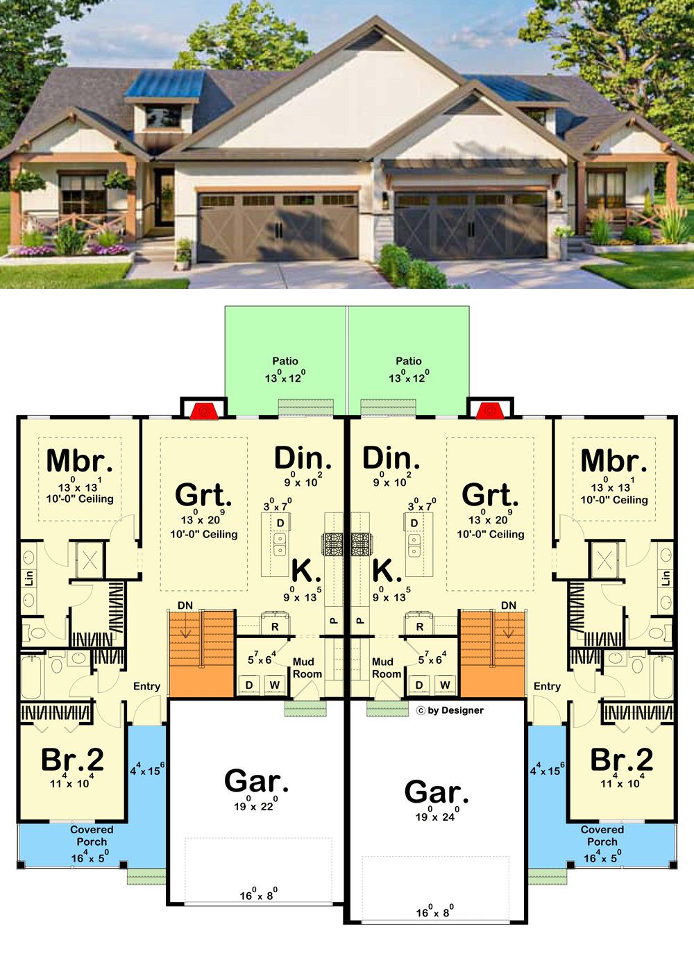 This plan offers a smart combination of modern farmhouse style and efficient duplex layout