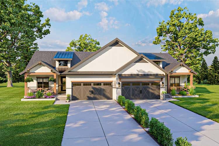 This plan offers a smart combination of modern farmhouse style and efficient duplex layout