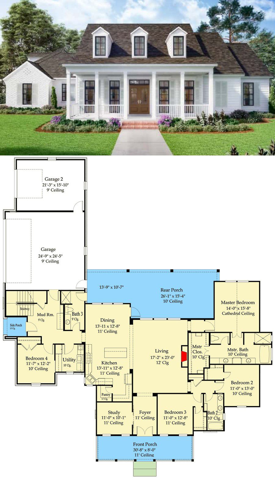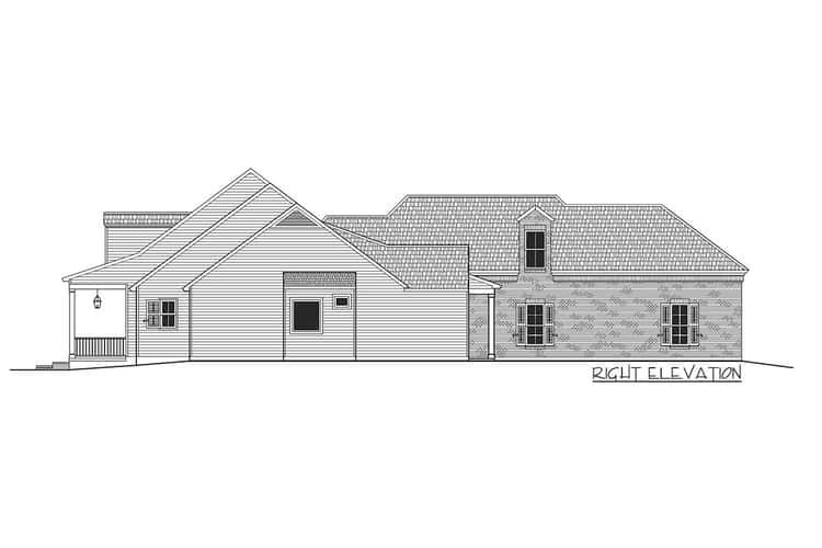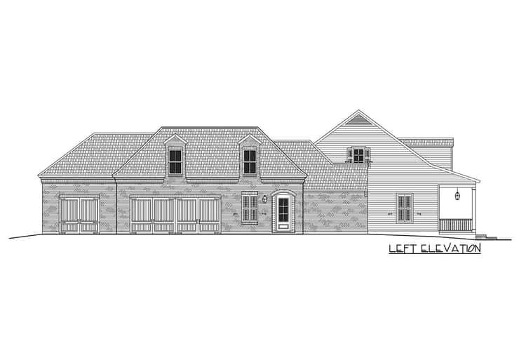 The home greets you with a generous, elongated front porch that spans much of the façade, setting a warm and inviting tone. Three dormers above the porch add architectural character and bring in additional daylight. The overall width is 84′6″ and depth is 95′4″, giving the house a substantial footprint. The roof’s primary pitch is 9 on 12, giving it a pitched, traditional silhouette. A 3-car garage is tucked to the side/rear, maintaining the aesthetics of the front façade. The style blends Acadian/Cape-Cod/Country/Farmhouse influences, with dormers, porch, and balanced proportions.