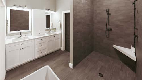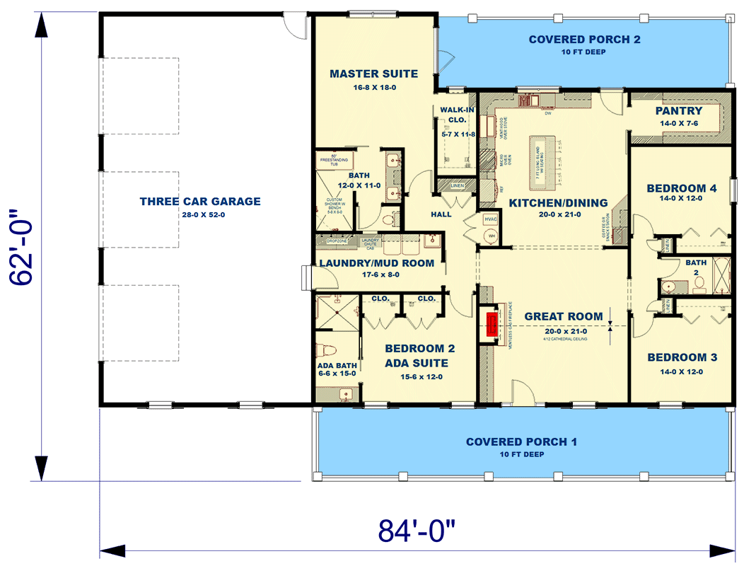 The plan includes four bedrooms and three bathrooms. One of these bedrooms is designed for accessibility (e.g., perhaps on the main level, with accessible bathroom and closet). The primary suite is well appointed: it includes a walk-in closet and a bathroom that features a free-standing tub, a custom shower, dual sinks, and direct access to a covered porch. (Source: description)