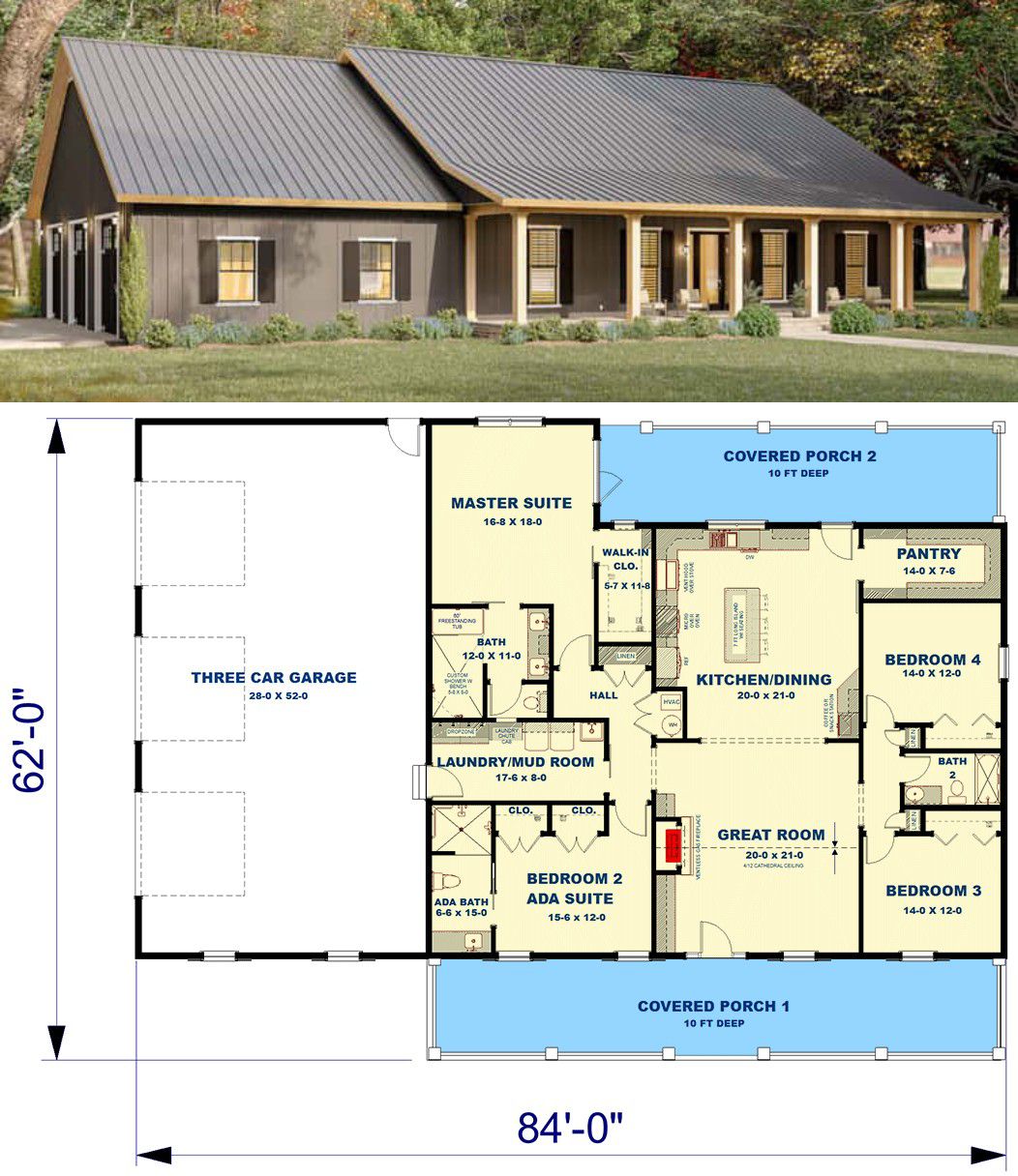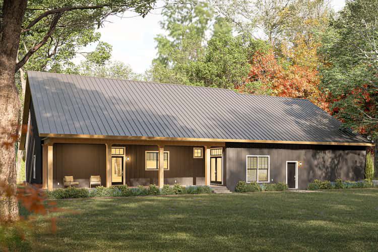 From the exterior, this plan captures the characteristic “barndominium” aesthetic—blending the robust, utilitarian barn-style form with refined residential finishes. You’ll find a broad roofline, likely a metal or standing-seam roof typical of barndo designs, wide eaves or a generous overhang for the porch or covered area. The front façade shows strong symmetry and an inviting covered porch (or multiple covered porch zones), giving it both welcoming character and shelter from the elements. The gable-end on the great room suggests tall windows or expansive glazing under the vault, which creates a dramatic front view.