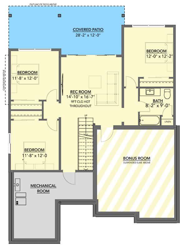 Here you’ll find the remaining three bedrooms, a rec/game room, a bonus room, and outdoor access via the walk-out. This expands usable living space beyond the main floor. The ceiling here is also 9 ft.