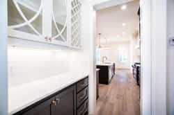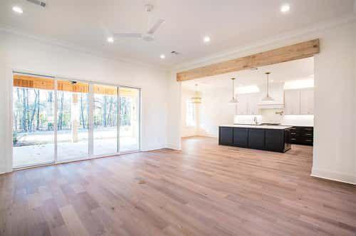You enter into a foyer (or mudroom transition) which flows directly into the great room / open concept living space. The open concept is emphasised: the living, dining and kitchen areas are all visually connected, with views out to the rear covered porch. The 10′ ceilings on the first floor heighten the sense of space.