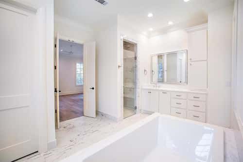 The master suite is located on the main level (so you won’t need stairs every day). It includes a luxurious bath: a large soaking tub is central, and the walk-in closet is “enormous” with two entrances (likely from the bedroom and from the bath). This suite is designed to feel like a private retreat.