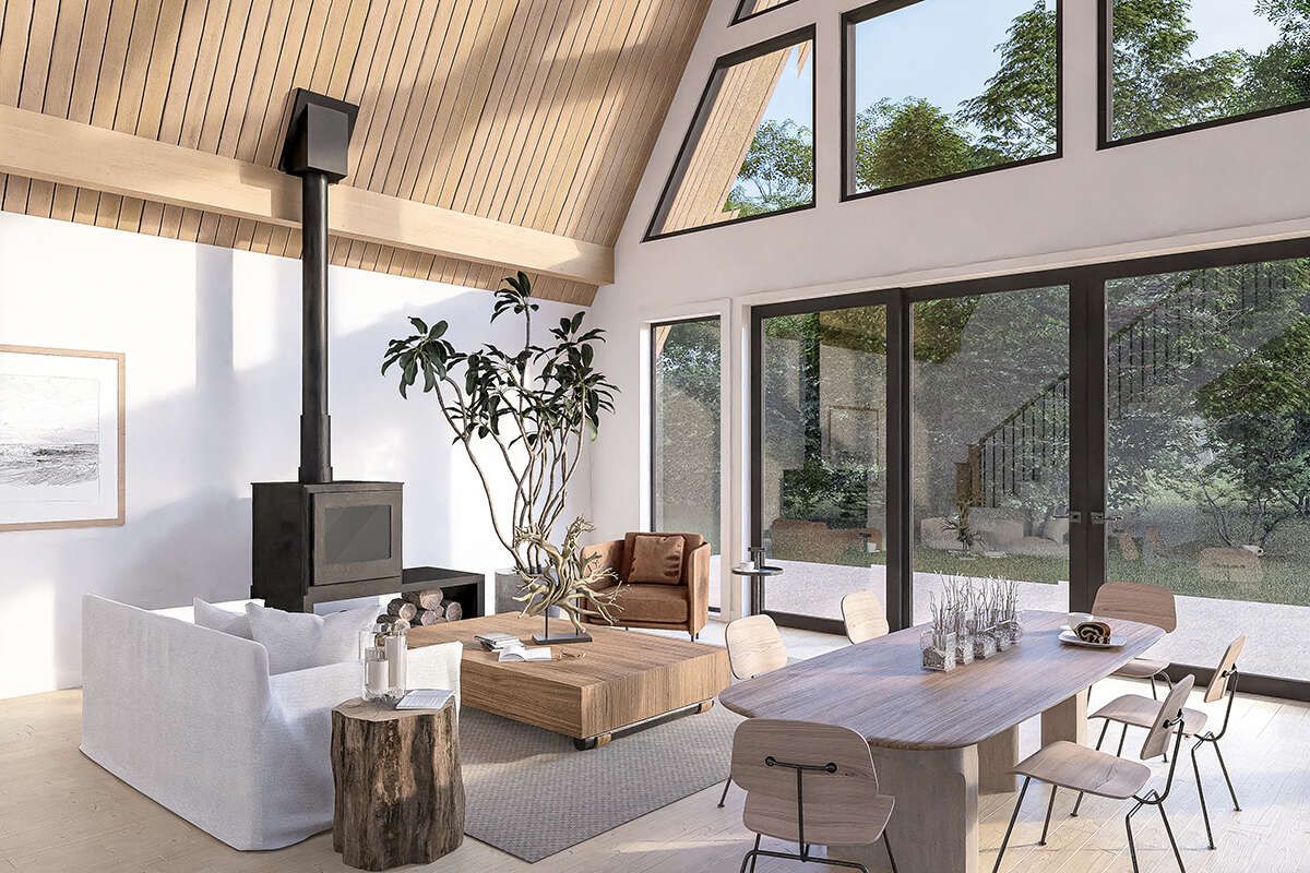 High vaulted ceilings, a signature feature of A-frame homes, create a dramatic and airy atmosphere, making the living space feel significantly larger than its footprint.