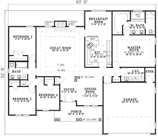 The design uses a split-bedroom plan: the master suite is privately located on one side of the house, while the other three bedrooms sit on the opposite side. 8 The master suite includes a walk-in closet, double vanities, a glass shower, and a whirlpool tub — a comfortable retreat for homeowners. 9