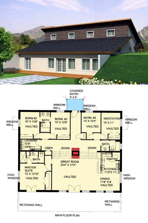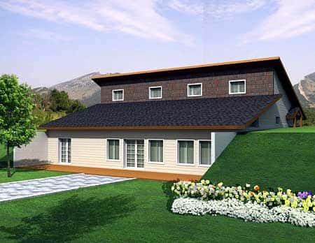 This distinctive berm house plan offers about 2,304 sq ft of thoughtfully arranged living space designed to nestle into a hillside—or “berm”—for a blend of energy efficiency, character, and indoor-outdoor connection. With up to 4 bedrooms and 3 bathrooms, vaulted ceilings, and abundant glazed openings, this home accommodates family life with a relaxed modern edge and a strong connection to its surroundings. 0