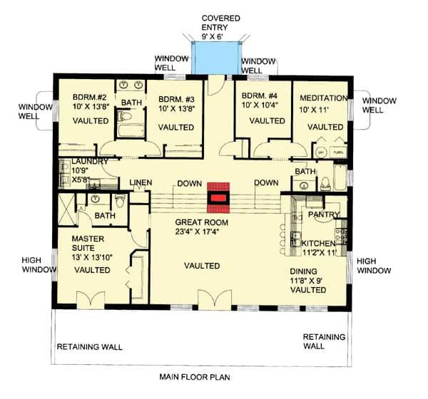 This attractive berm house plan reimagines traditional ranch living with earth-sheltered efficiency and modern architectural clarity. Vaulted ceilings, generous glass, and thoughtful room placement create a home that feels open and connected while preserving privacy and practicality. Whether you’re drawn to eco-conscious design, unique aesthetics, or indoor-outdoor living, this plan delivers a distinctive and comfortable lifestyle rooted in place and purpose. 0