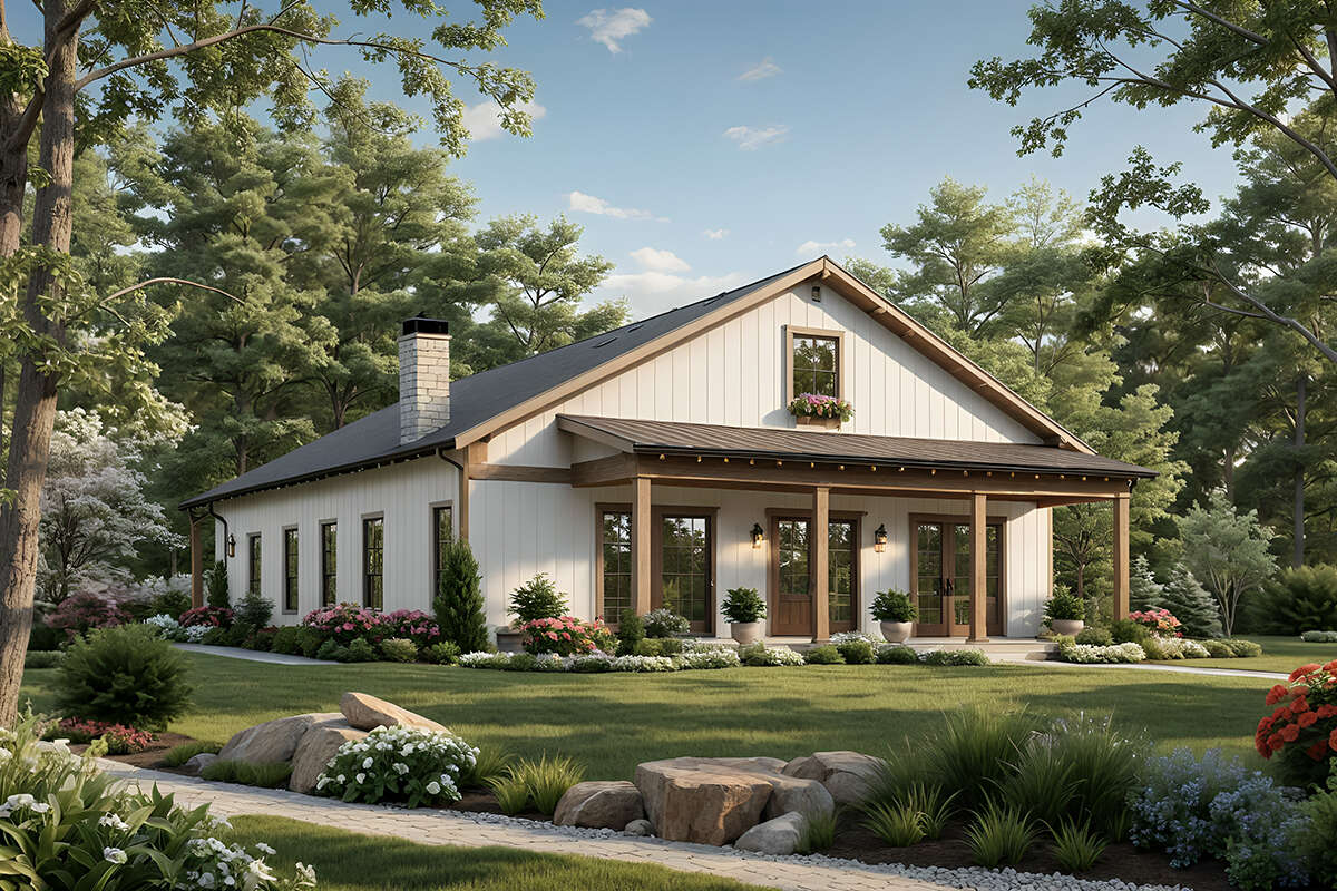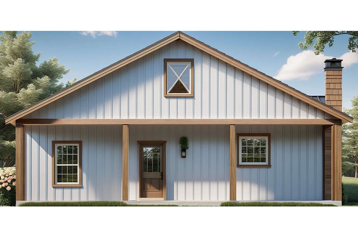 The exterior showcases a traditional barn-inspired design with a long rectangular shape, simple rooflines, and a bold yet clean appearance. This style is known for durability, simplicity, and timeless rural charm.
