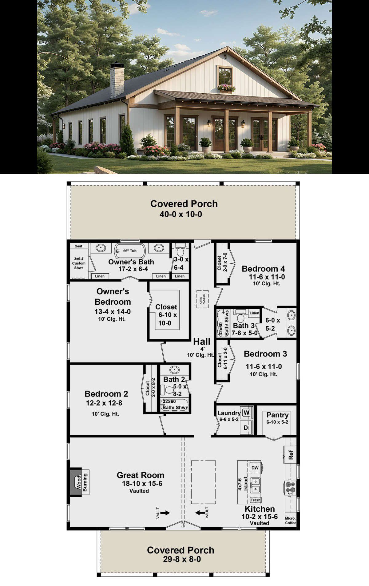 This barn house plan offers a perfect blend of rustic style, spacious living, and modern functionality. With its four-bedroom layout, open design, and outdoor living areas, it is an excellent choice for building a comfortable and distinctive family home.