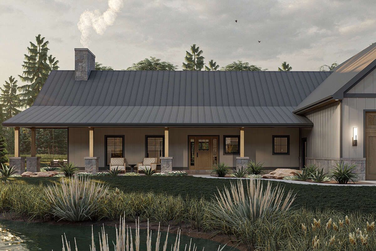 The exterior showcases a classic barn-inspired design with a wide footprint, simple rooflines, and a strong visual presence. One of the standout features is the wraparound porch, creating a warm and welcoming outdoor space. 1With overall dimensions of approximately 86 feet 4 inches wide and 76 feet deep, the home is best suited for medium to large plots. 2