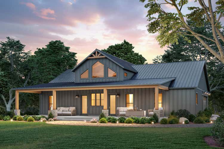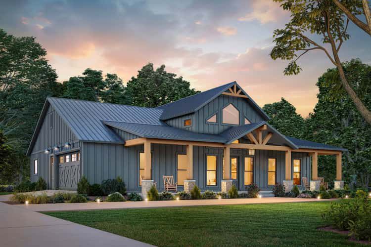 The exterior carries the distinctive “barndo” character: straightforward lines, barn-style proportions, and a side-entry garage tucked to the side — preserving a clean, balanced facade. 0