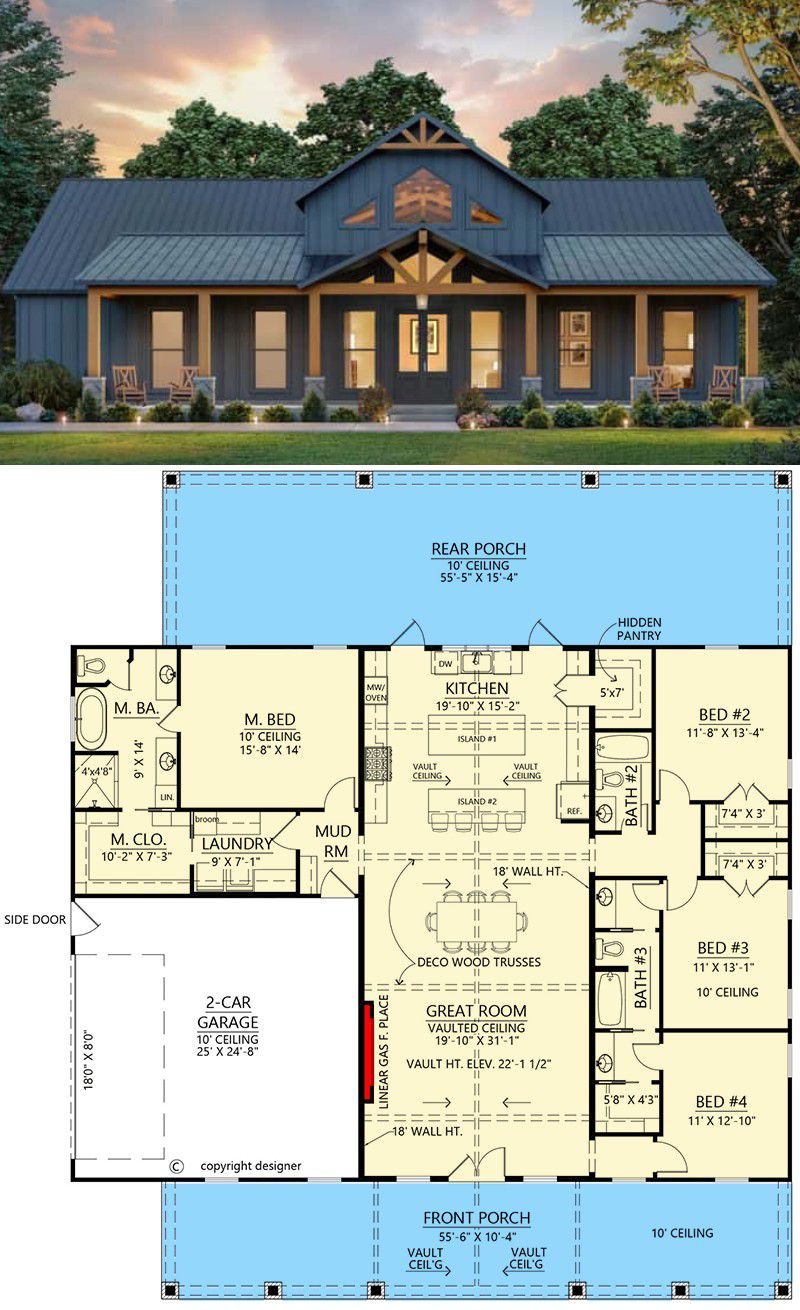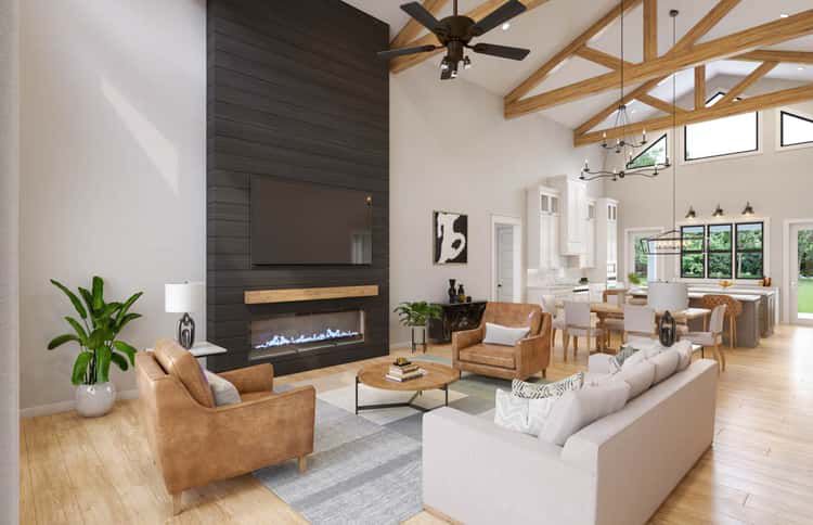 - Design Style: Barndo-style farmhouse — barn-inspired exterior, open-concept interior, exposed trusses and vaulted great room 8