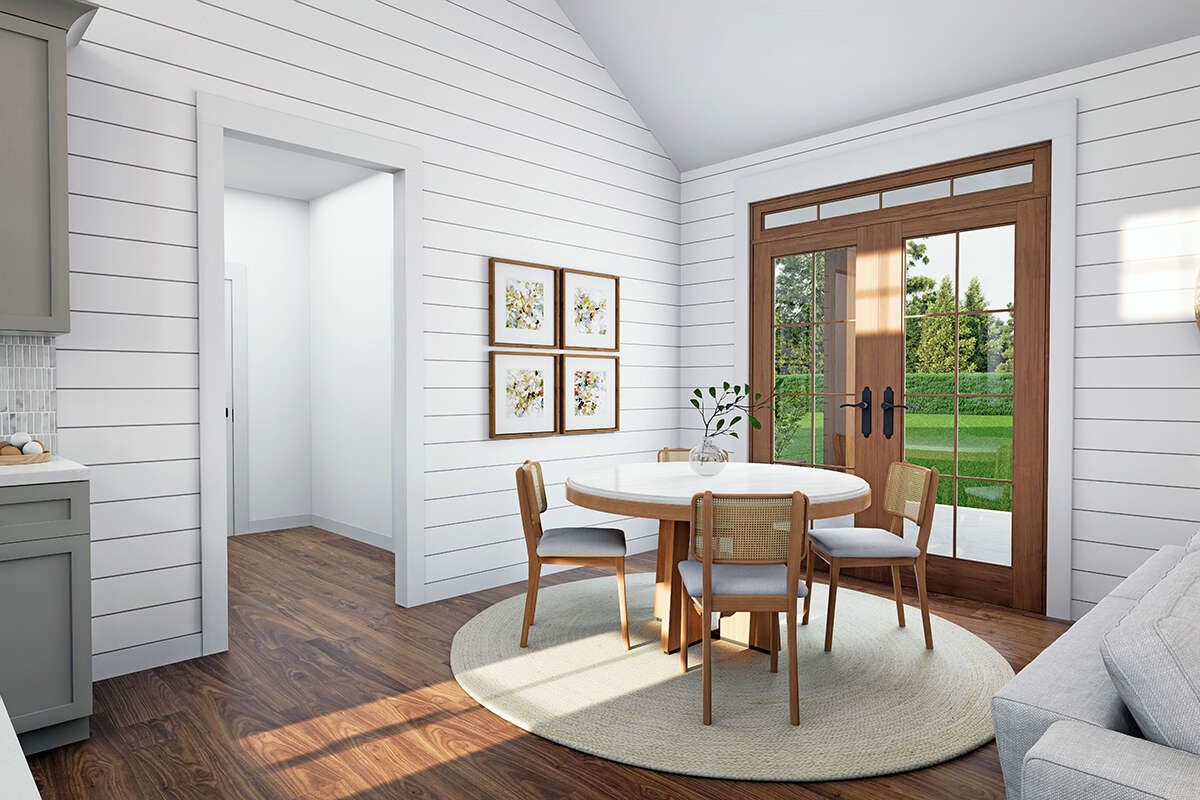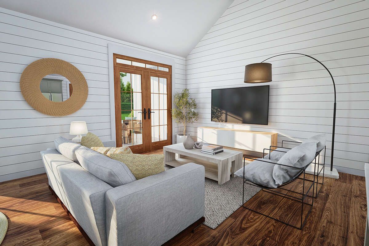 The entire 1,454 square feet of living space is arranged on one level, offering easy accessibility and a smooth flow between rooms. The layout emphasizes open living areas while maintaining comfortable separation between private and shared spaces. 2
