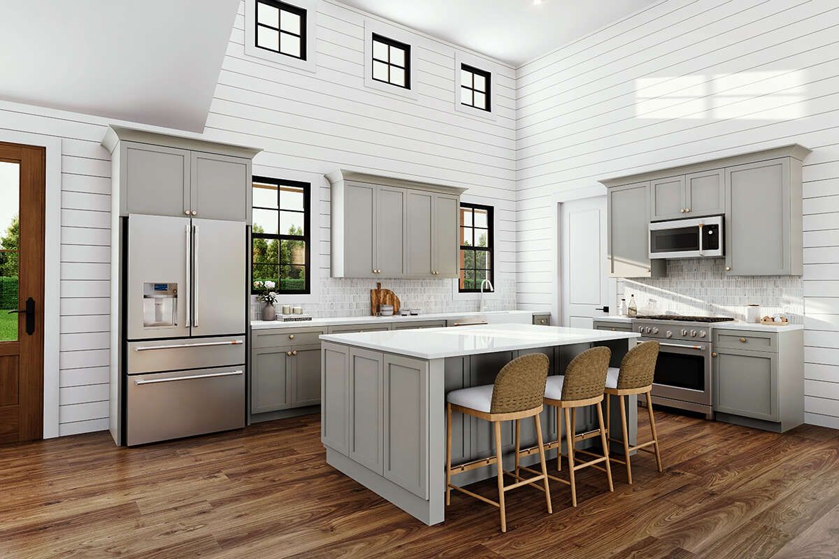 The kitchen is designed for efficiency and practicality, typically featuring ample counter space, cabinetry, and a central island. This layout allows homeowners to cook while staying connected to activities in the living and dining areas.