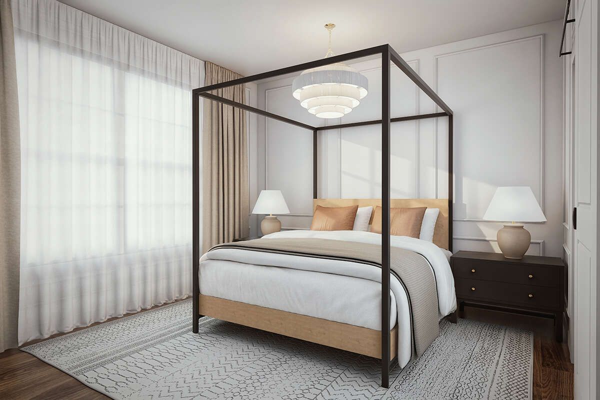 The design includes two full bathrooms. The primary bathroom is connected to the owner’s suite, while the second bathroom is positioned for easy access from the secondary bedroom and main living areas. 3