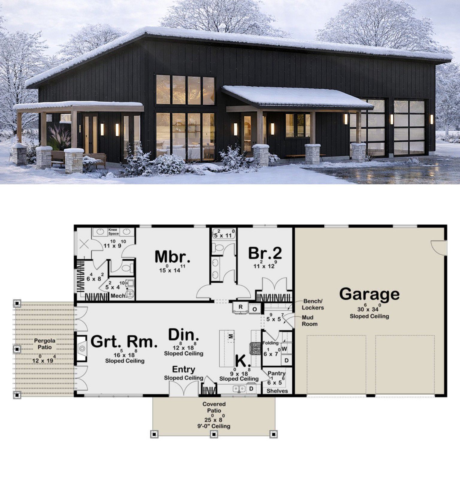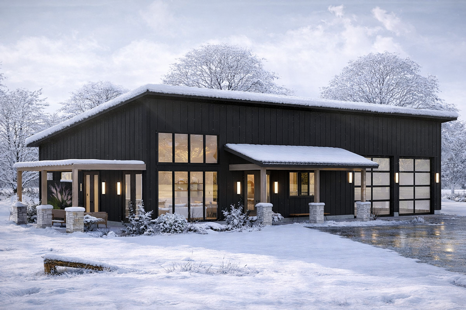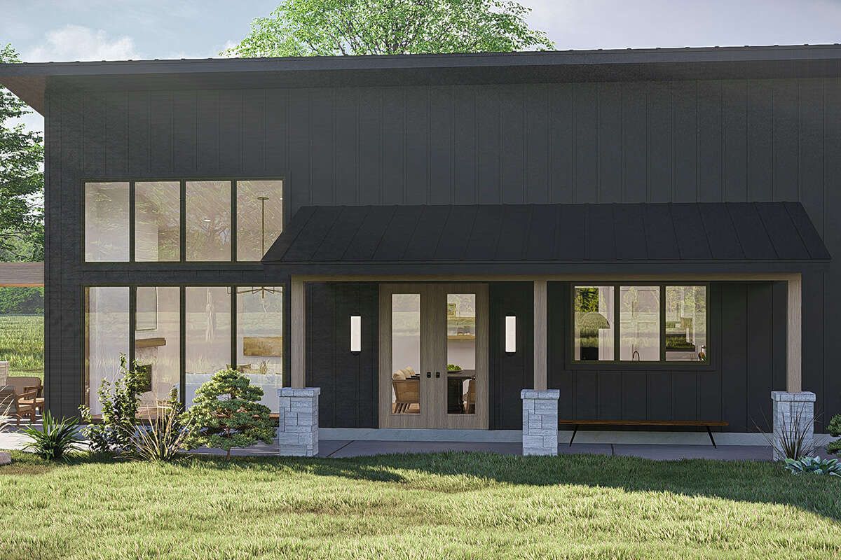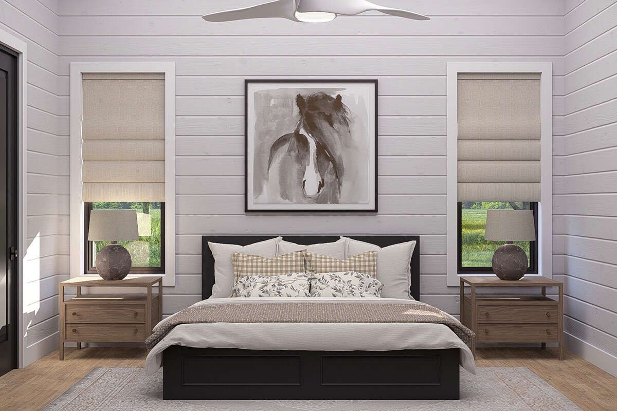 A generous combination of front porch and patio space totaling about 426 square feet enhances the home’s exterior, creating inviting outdoor areas for relaxing or entertaining. The low 2:12 roof pitch adds to the barn-style aesthetic while maintaining structural efficiency. 2