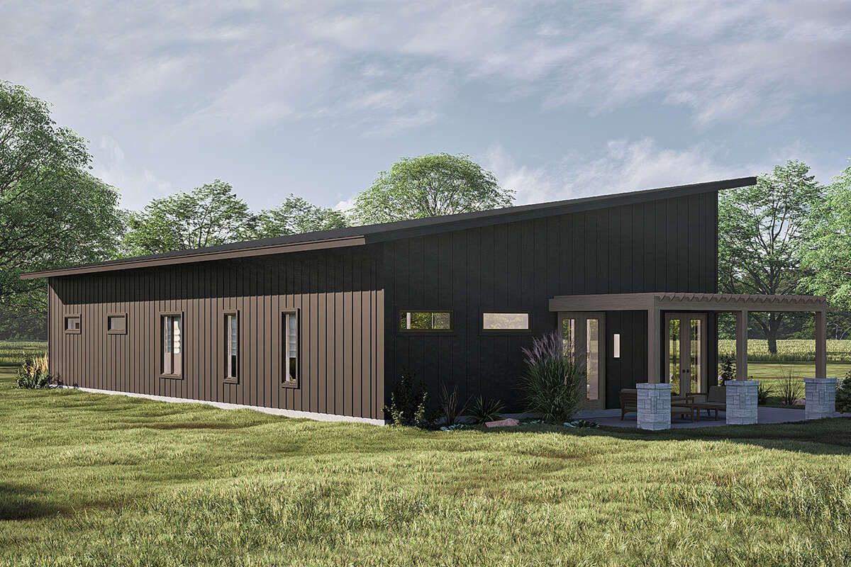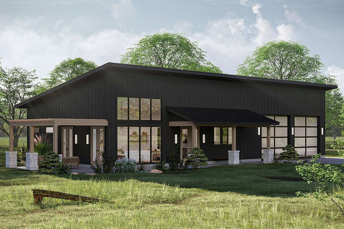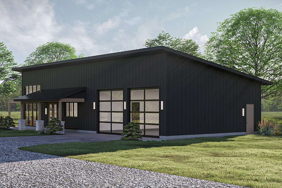 This barndominium house plan offers a unique combination of rustic charm and modern living efficiency. With its open layout, spacious garage, and high ceilings, it provides a versatile and comfortable home suited for a wide range of lifestyles.