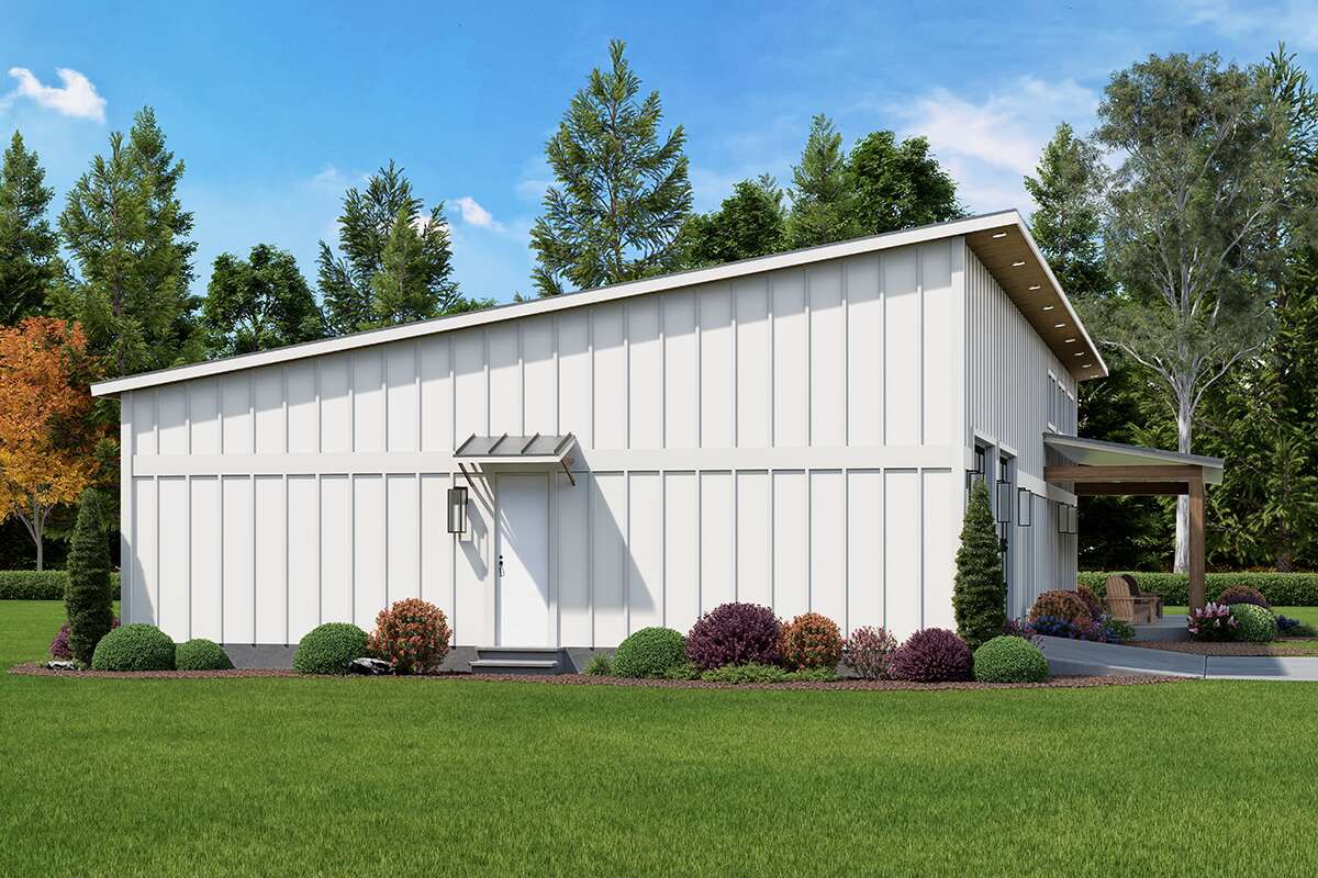 This modern barndominium design offers approximately 2,000 square feet of heated living space with three bedrooms, two full bathrooms, and one half bathroom. The layout featured in
