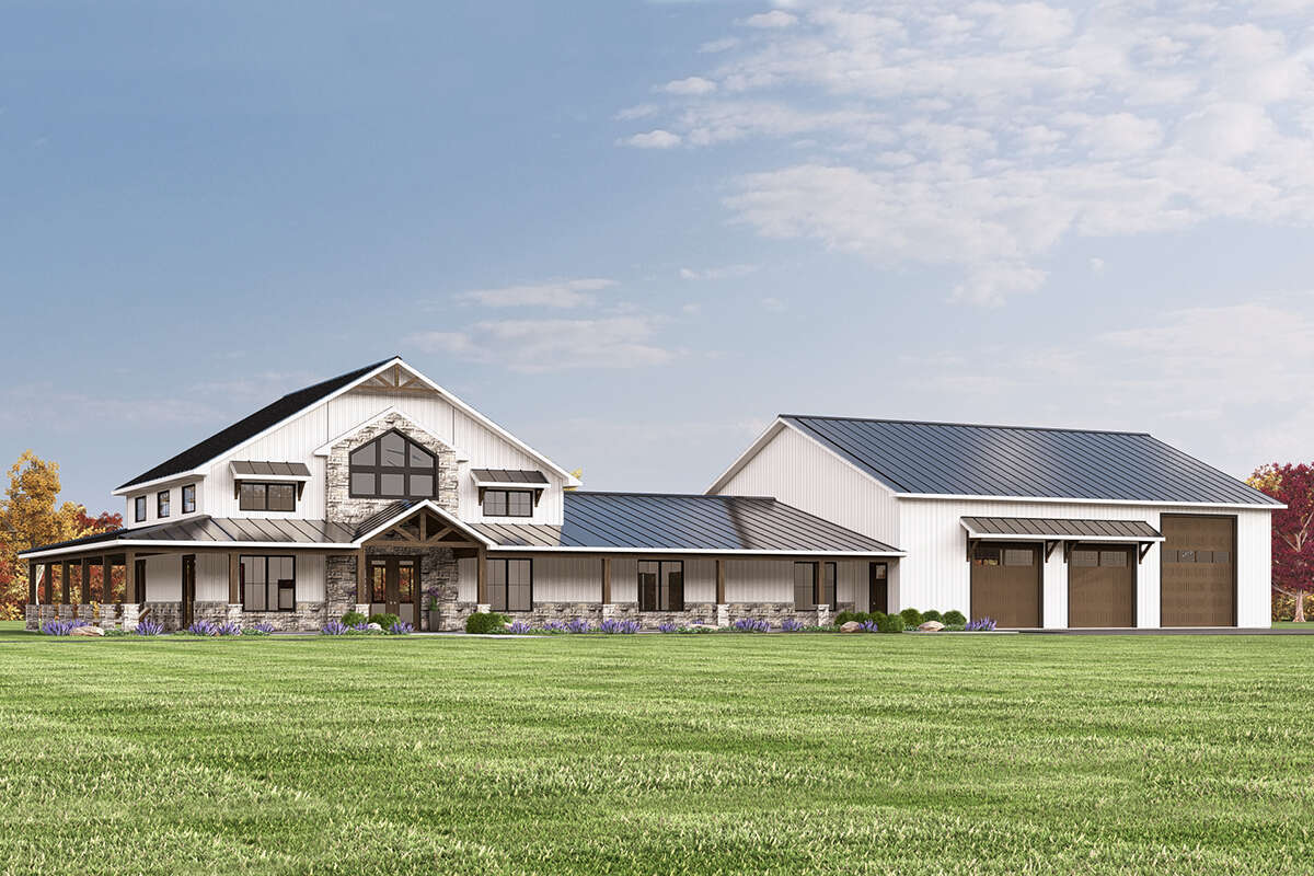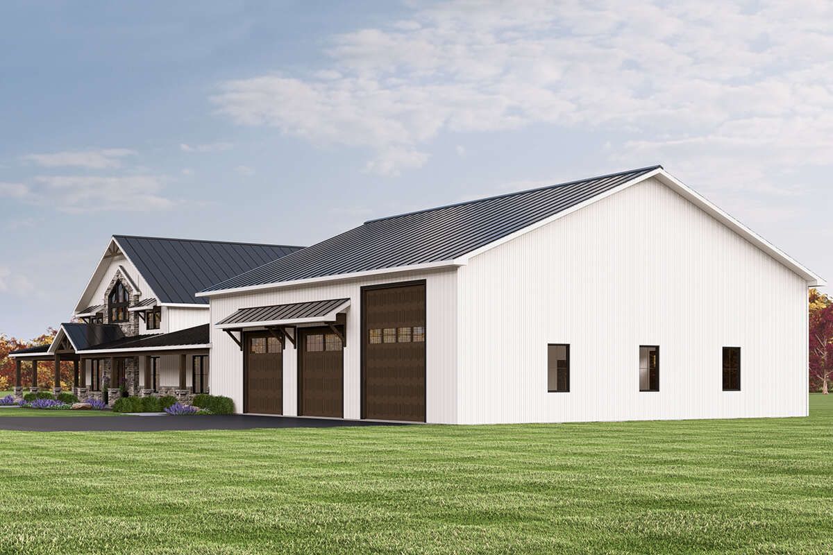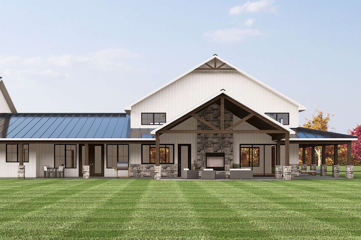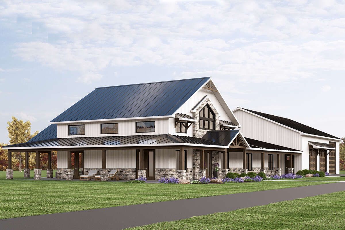 this barndominium house plan blends rustic barn-style architecture with modern residential comfort, creating a bold and highly functional living space.