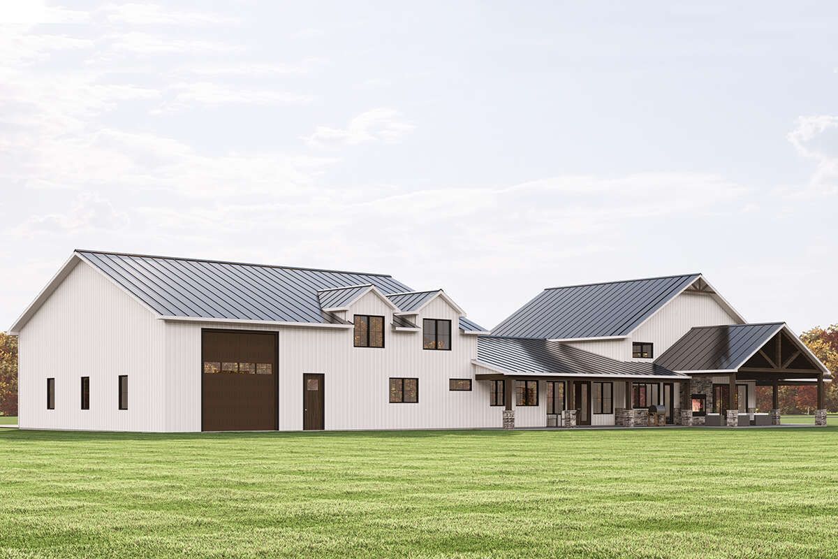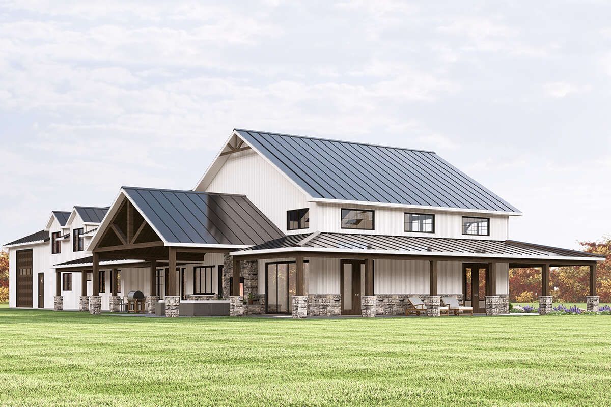 The exterior showcases a barn-inspired design with a large rectangular footprint, metal roofing, and clean vertical lines. This style is both durable and visually distinctive, offering a modern take on rural living.