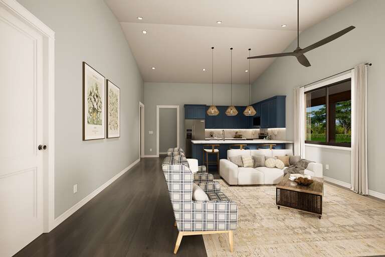 The kitchen is positioned at the center of daily life, designed to support cooking, serving, and gathering without wasting space. In a smaller home, the kitchen has to be efficient, and this plan keeps it functional and comfortable.