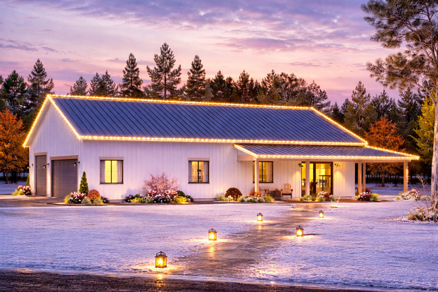 • Rustic barndominium curb appeal with a modern, welcoming feel.