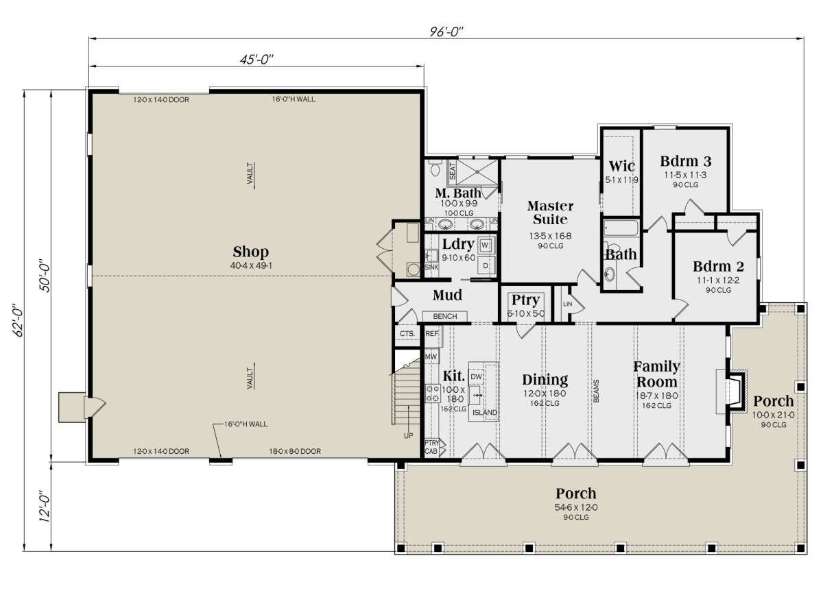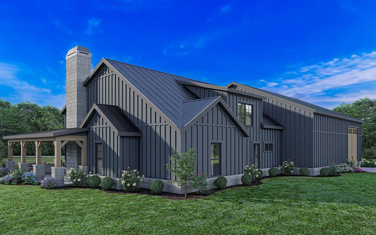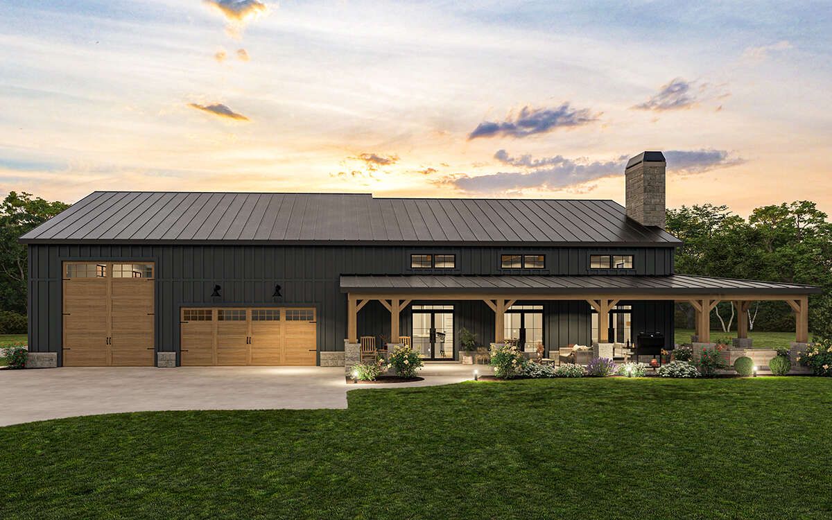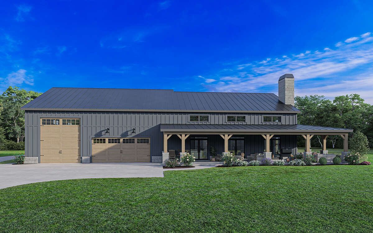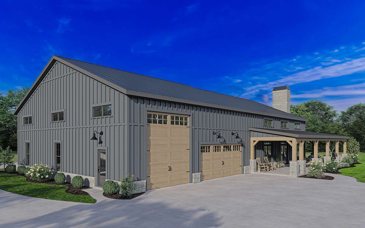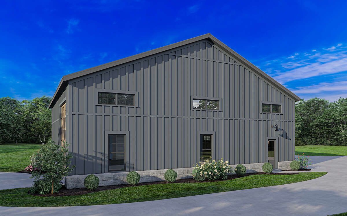 The exterior embraces the classic barndominium style with a bold and expansive footprint measuring approximately 96 feet wide and 62 feet deep. 1 The wide façade and simple structural lines create a strong, functional appearance suited for both rural and suburban settings.