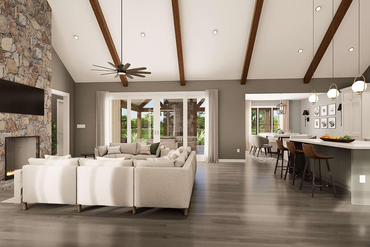 The central great room acts as the heart of the home, seamlessly flowing into the dining and kitchen zones — an ideal configuration for both casual and formal gatherings. Large windows help fill the space with natural light, enhancing the openness and inviting atmosphere throughout. The kitchen typically includes ample counter space, cabinetry, and a functional layout that supports meal prep, storage, and everyday use. ([houseplans.net](https://www.houseplans.net/floorplans/00900441/barndominium-plan-2308-square-feet-3-bedrooms-2.5-bathrooms))