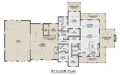 This expansive barndominium design offers approximately 3,169 square feet of heated single-story living space with three bedrooms, two full bathrooms, a half-bath, and a generous two-car garage. Blending rustic barn-inspired architecture with comfortable residential living, this layout is ideal for families, hobbyists, and those seeking abundant space under one roof.1