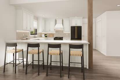 The kitchen is laid out for both practicality and interaction. Its location within the open floor plan keeps the cook connected to the rest of the home, encouraging social flow. Ample counter space and cabinetry support everyday meal preparation and storage, while a generous island doubles as a casual dining zone or workspace.