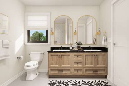 A conveniently located half bathroom near the main living spaces adds everyday practicality and supports entertaining without intruding on private bathroom zones. This design choice enhances day-to-day usabilit