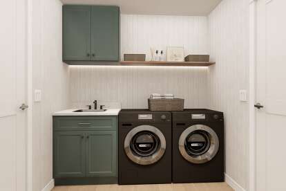 A dedicated laundry area contributes to an organized home, making daily chores easier and more efficient. Storage is thoughtfully integrated throughout the plan, supporting clutter-free living and accessibility without detracting from the barndominium’s bold open design.